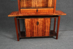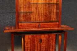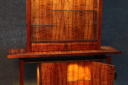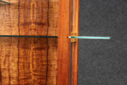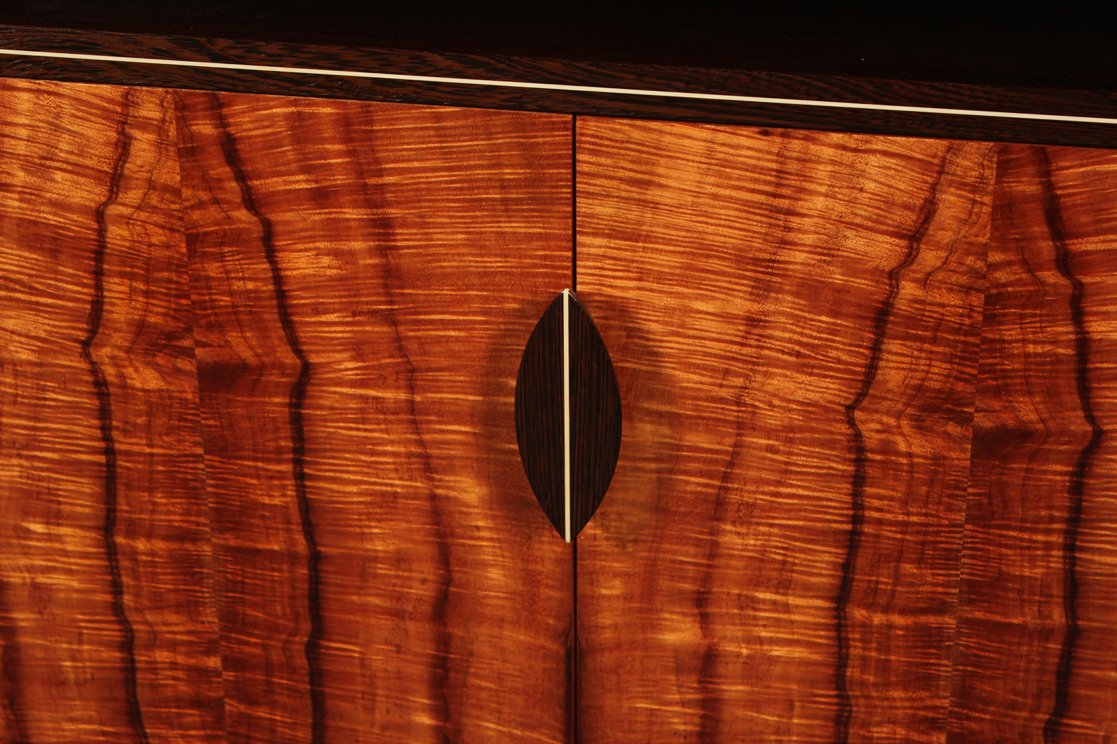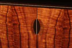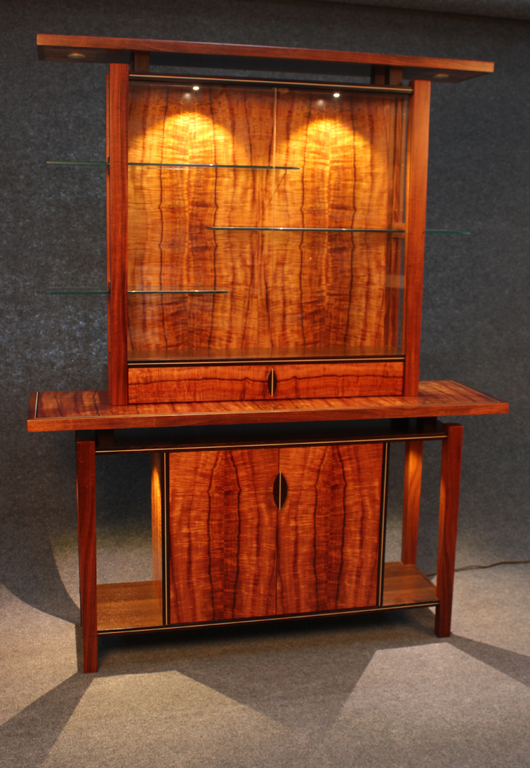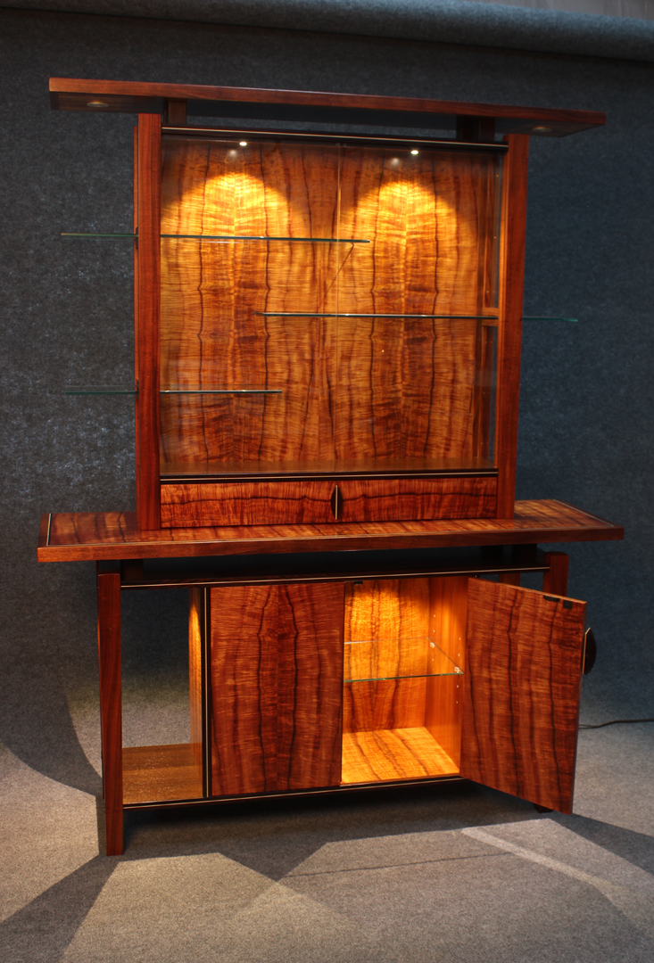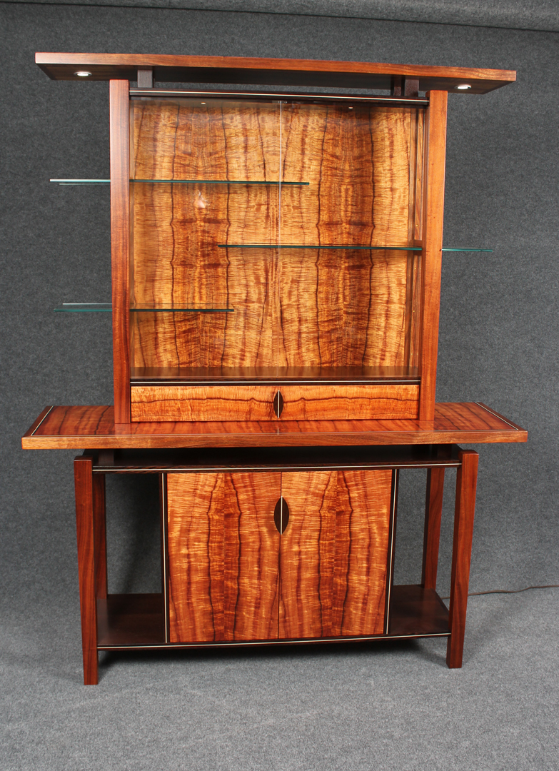 China cabinet This is cabinet I custom built for a client, to display china and other collectibles. Curly Koa throughout with accents and details of Wenge and Holly. China cabinet Built in lights spotlights everywhere Koa with Wenge accents and Holly striping. Detail of handle Detail of glass shelf