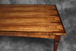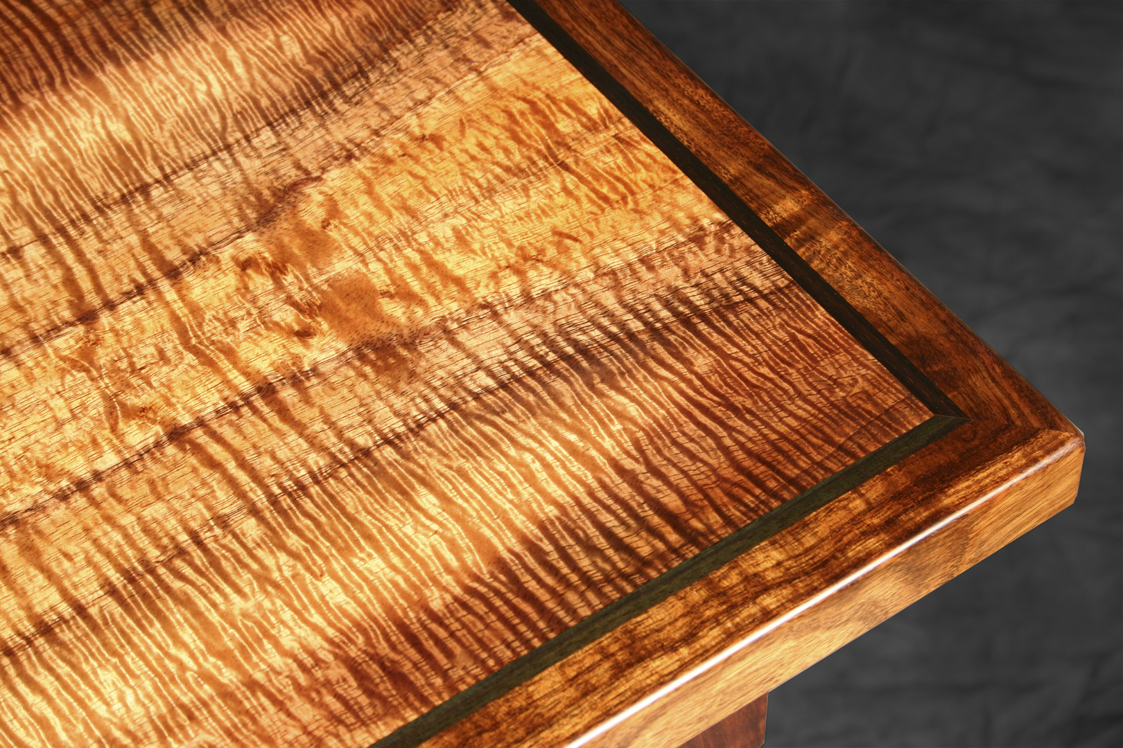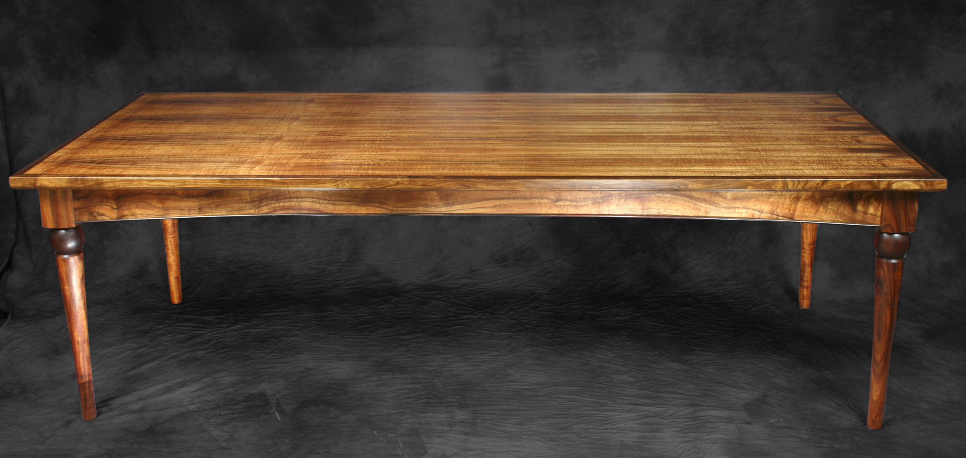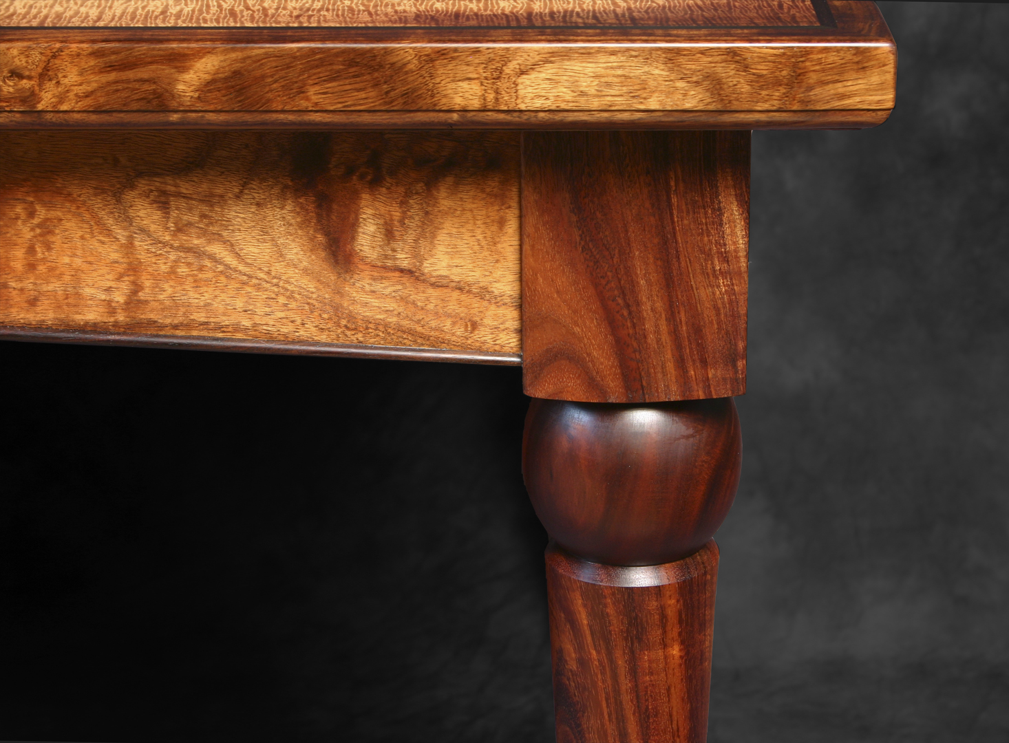 the doctor's table 8 feet long table. Curly koa! Detail of the curly koa top. Detail of the turned leg, koa and milo wood.