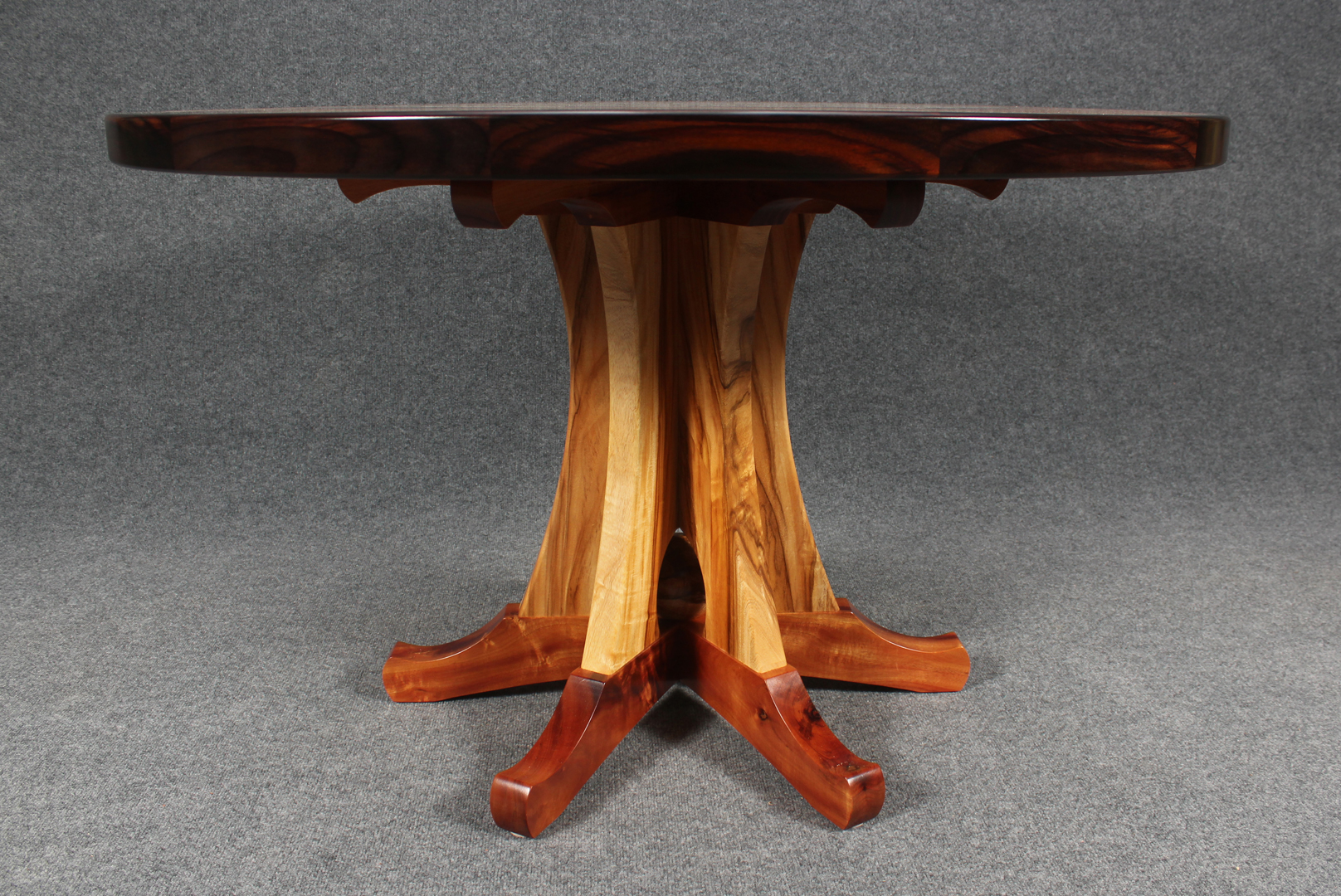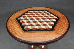 This is a table I built out of the passion of playing with veneers. It started with the geometrical pattern in the center, and everything grew around that. This table is currently on display and FOR SALE at the Martin & McArthur gallery at the Kings Shops in Waikoloa. This will be a perfect elegant foyer table in a large entry way. Scroll down for a video.