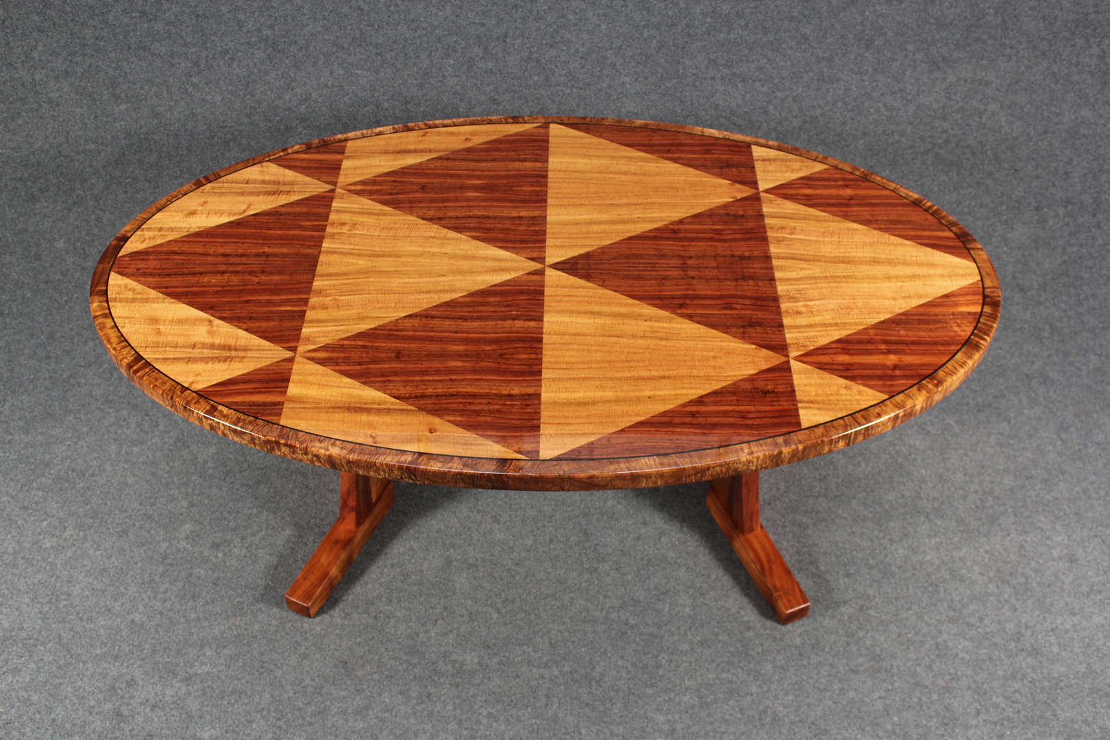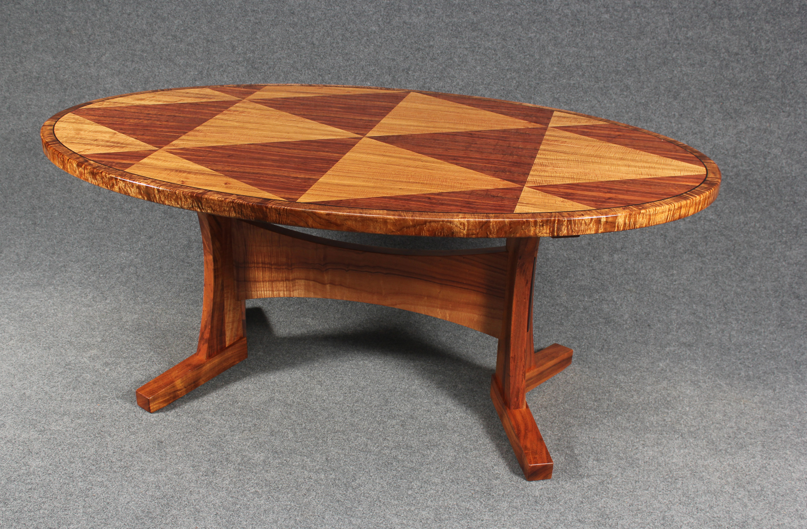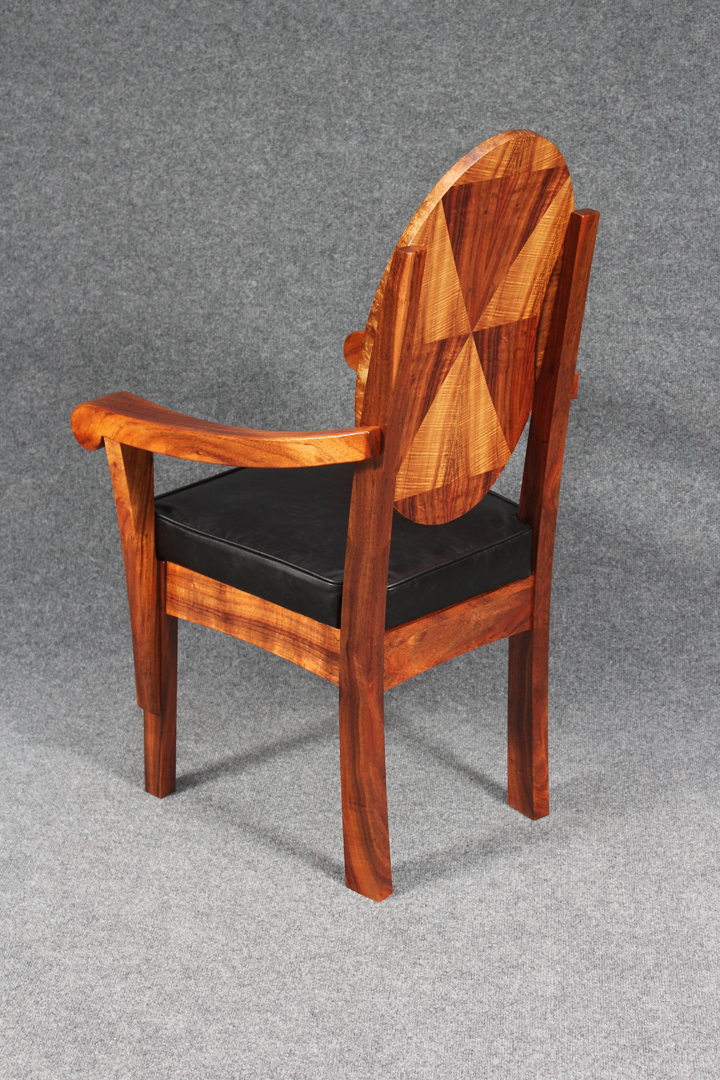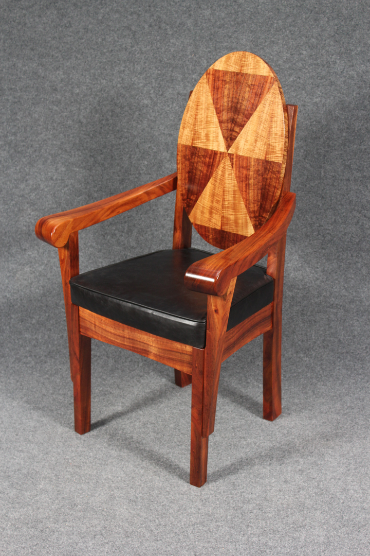 Sears dining set This custom dining set is not from Sears, it is the name of my client. The whole set Elliptical dining table Curly koa, two tones. ebony inlay, curly Koa edging. Equilateral triangels of two different colored Koa veneers. Detail of the edging, curly Koa. Side chair. Koa and black leather Side chair. Koa and black leather Side chairs. Koa and black leather The head of the table chair The head of the table chair