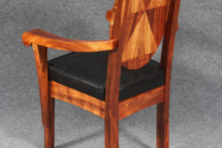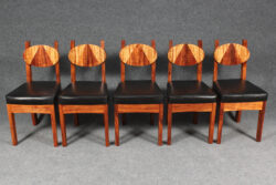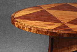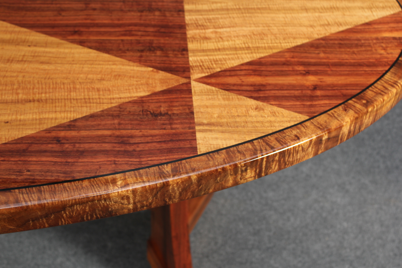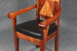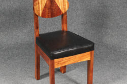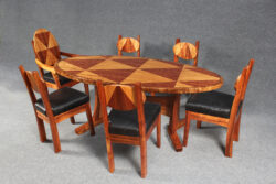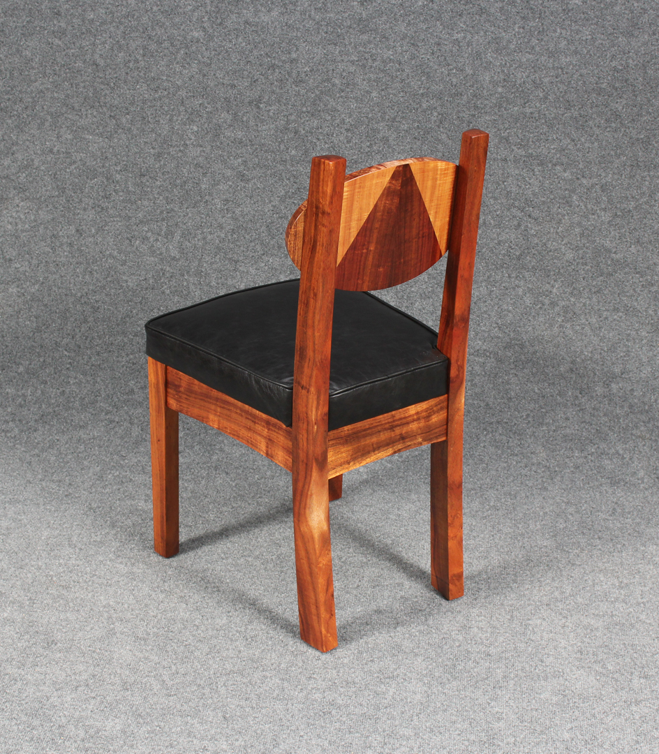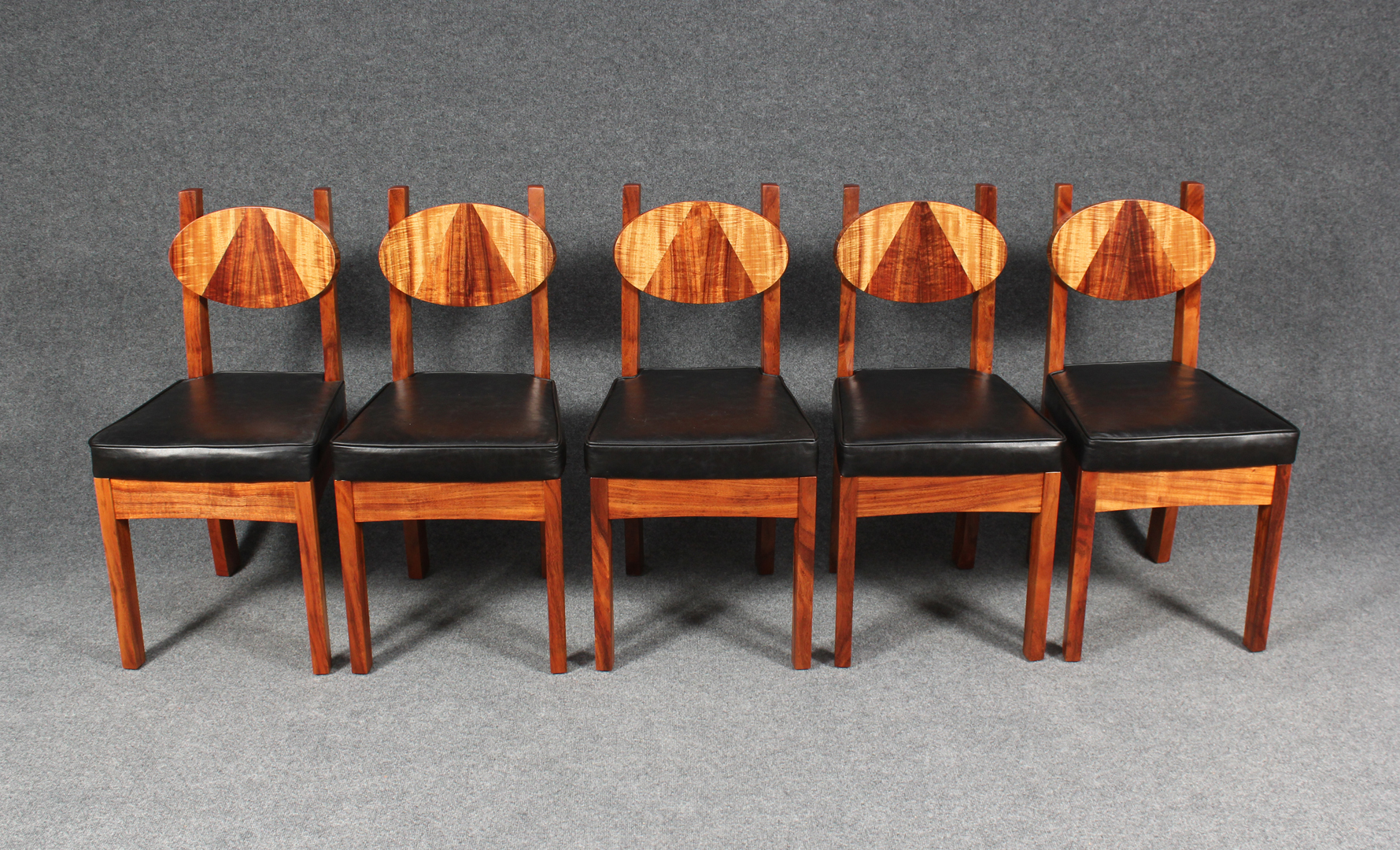 Sears dining set This custom dining set is not from Sears, it is the name of my client. The whole set Elliptical dining table Curly koa, two tones. ebony inlay, curly Koa edging. Equilateral triangels of two different colored Koa veneers. Detail of the edging, curly Koa. Side chair. Koa and black leather Side chair. Koa and black leather Side chairs. Koa and black leather The head of the table chair The head of the table chair