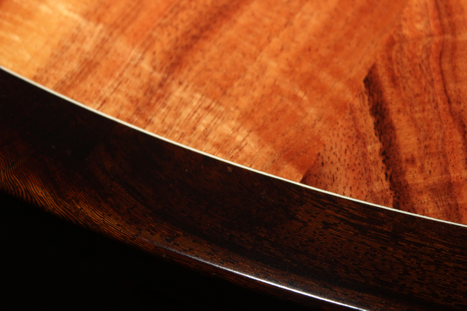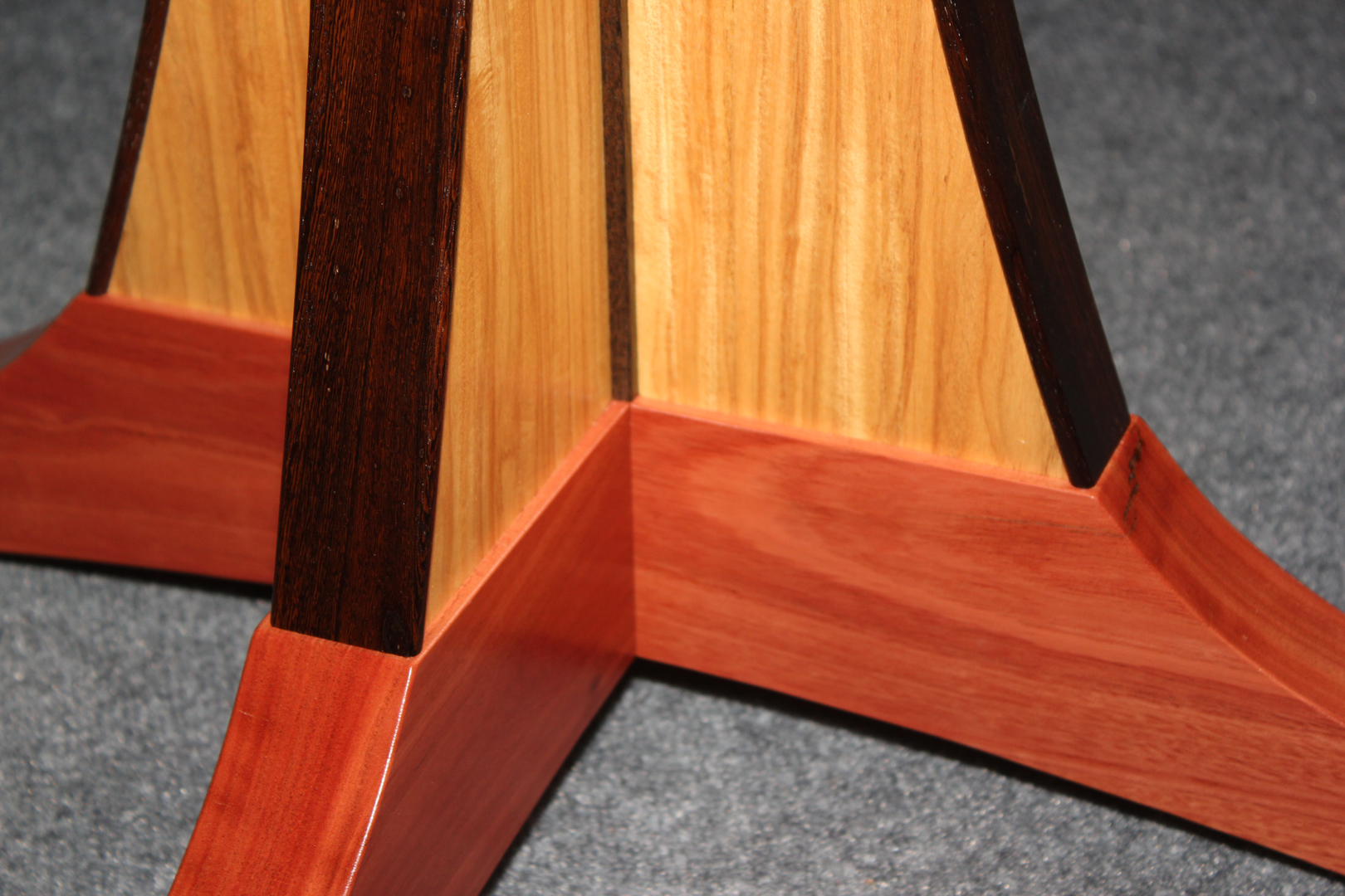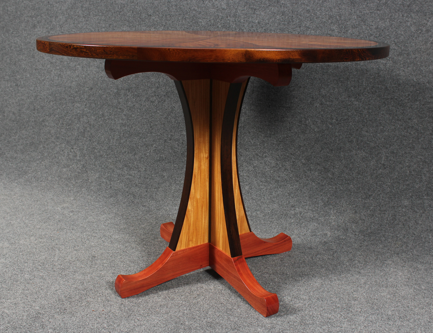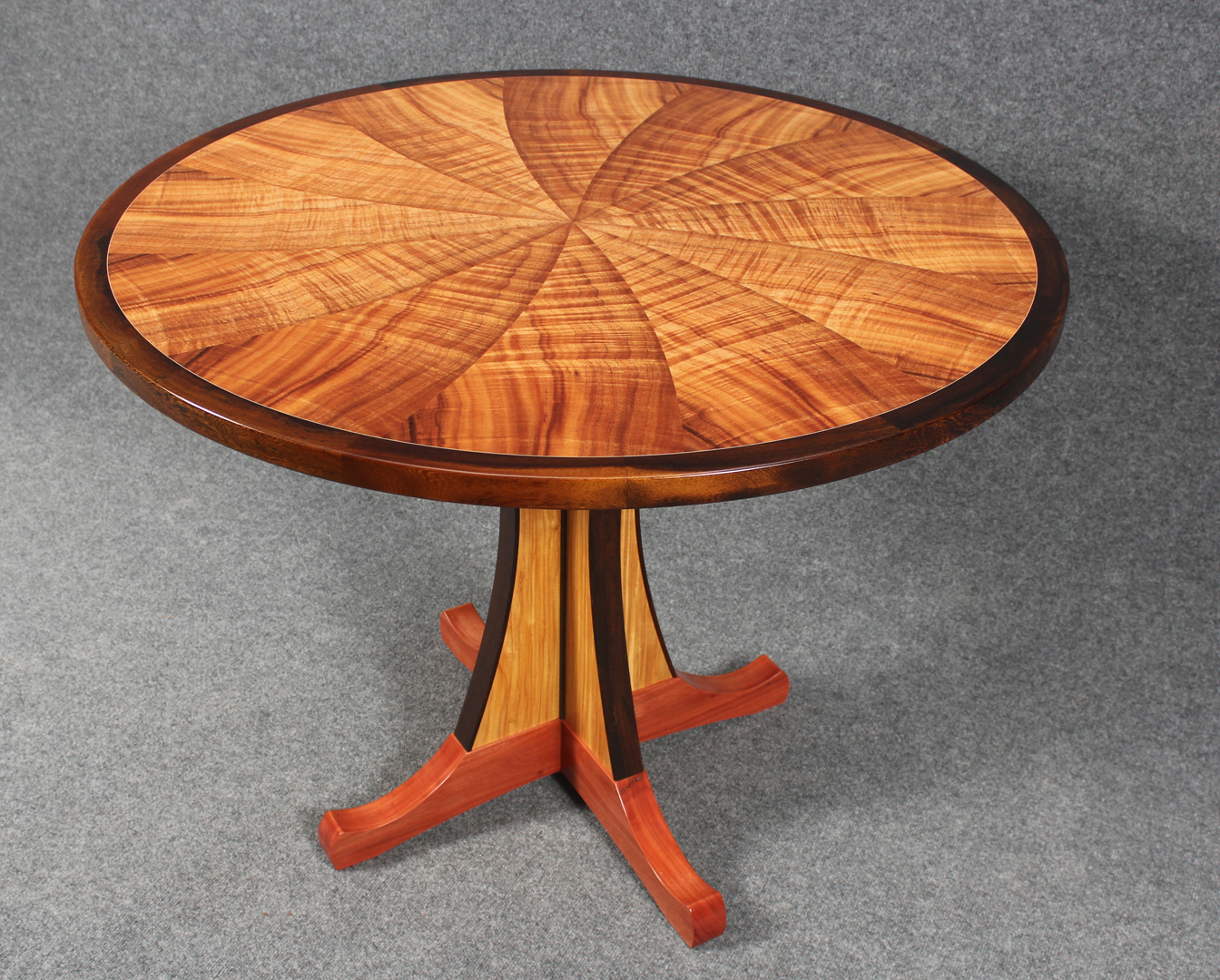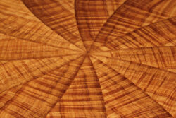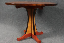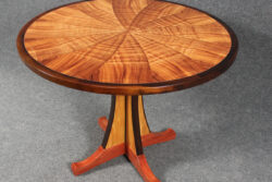 Vortex Series # 4 This table features highly curly koa veneers, joined in a spiral pattern. The edging is solid Pheasantwood. 40″ diameter, 30″ tall. Vortex Series #4 The top Pedestal Detail Edge Detail of base